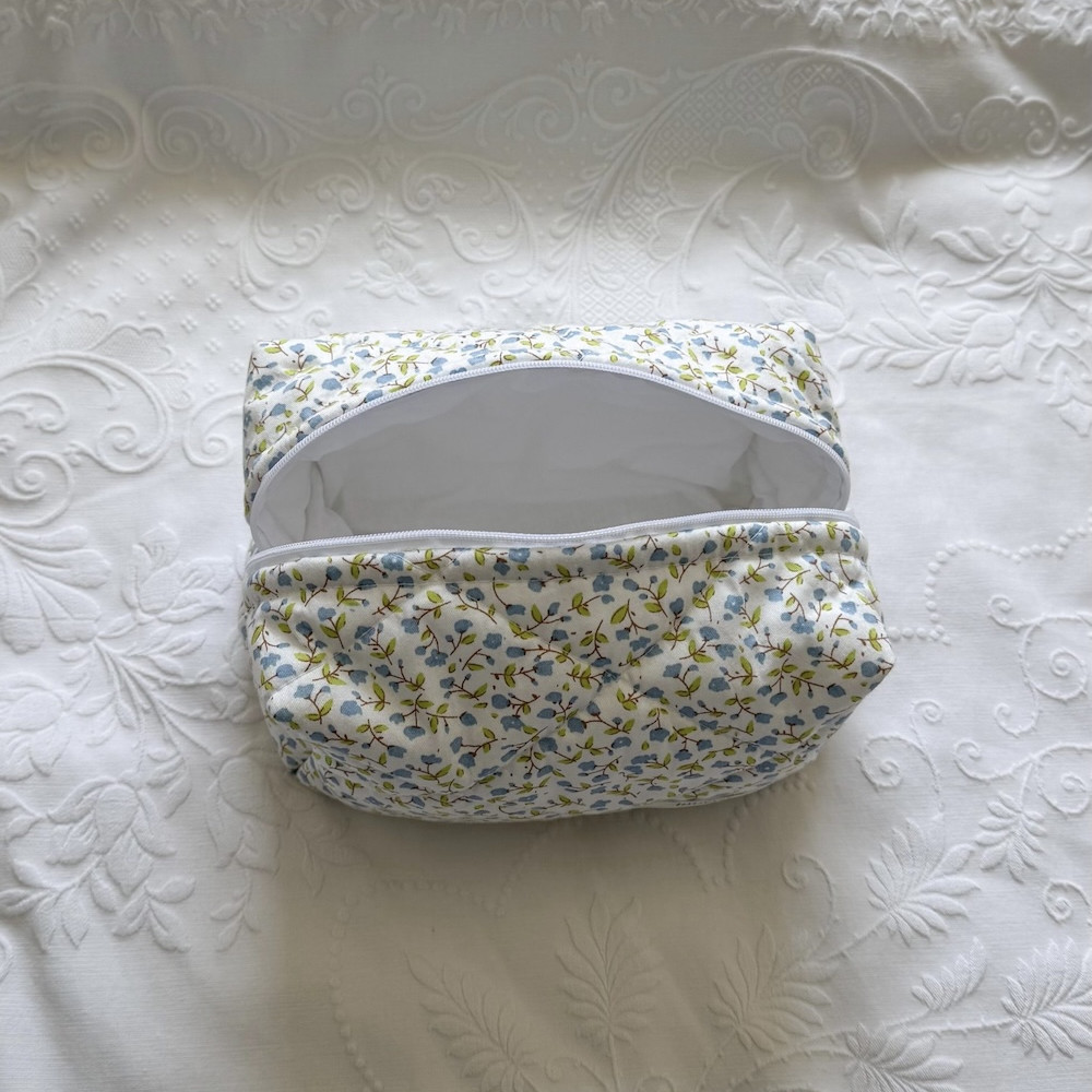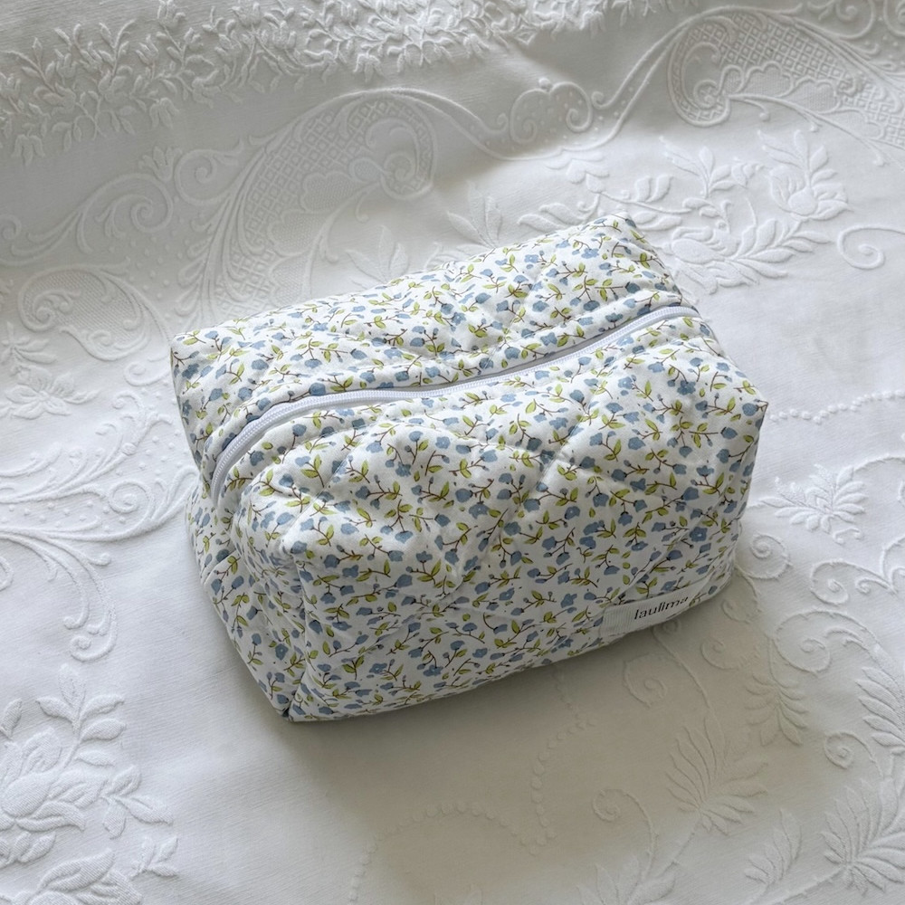 Χειροποίητο καπιτονέ νεσεσέρ με λουλουδάτο μπλε ύφασμα, ιδανικό για αποθήκευση καλλυντικών, προσωπικών ειδών ή μικρών αξεσουάρ.