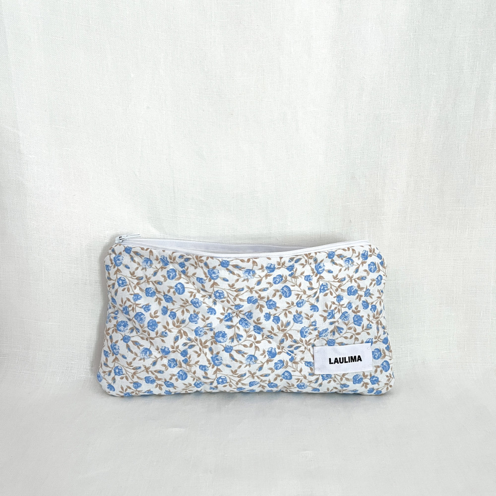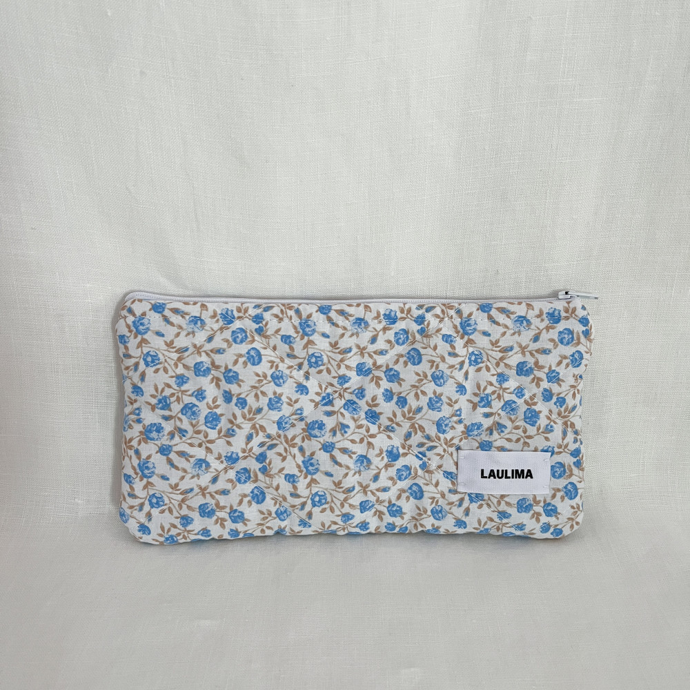 Χειροποίητο καπιτονέ νεσεσέρ από βαμβακερό ύφασμα με γαλάζια λουλούδια, ιδανικό για μολύβια ,καλλυντικά ή μικρά αξεσουάρ. Το εσωτερικό ύφασμα είναι βαμβακερό άσπρο.