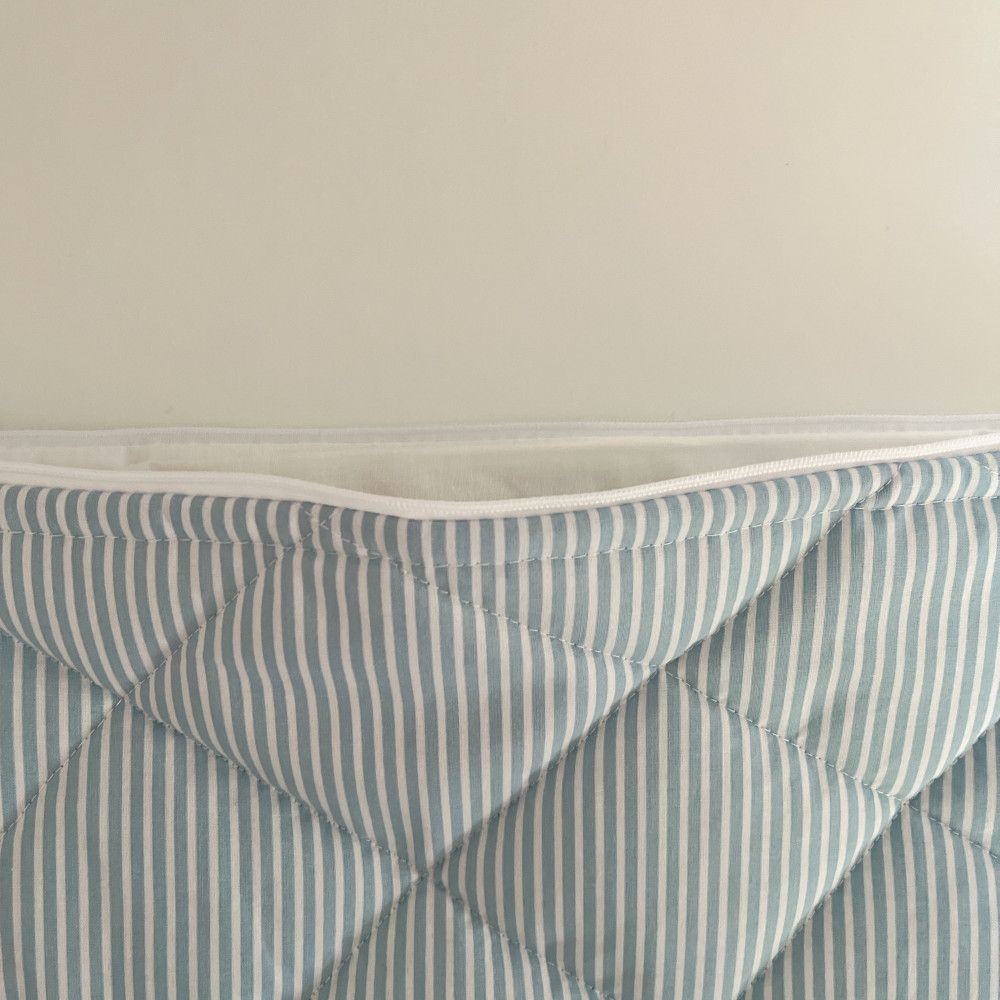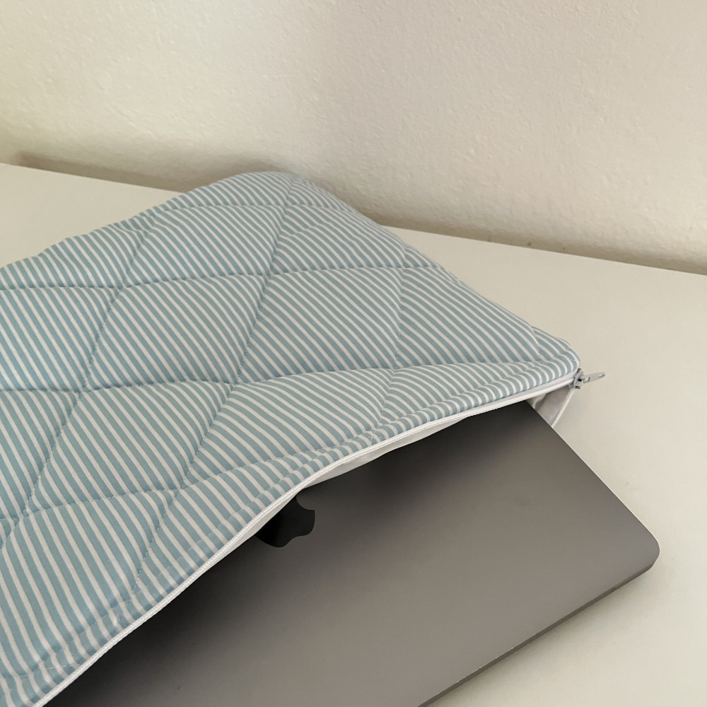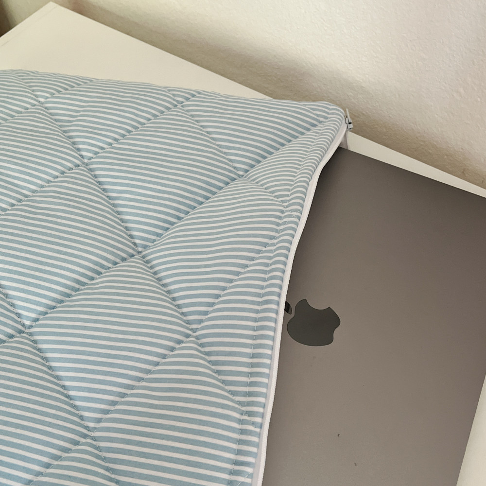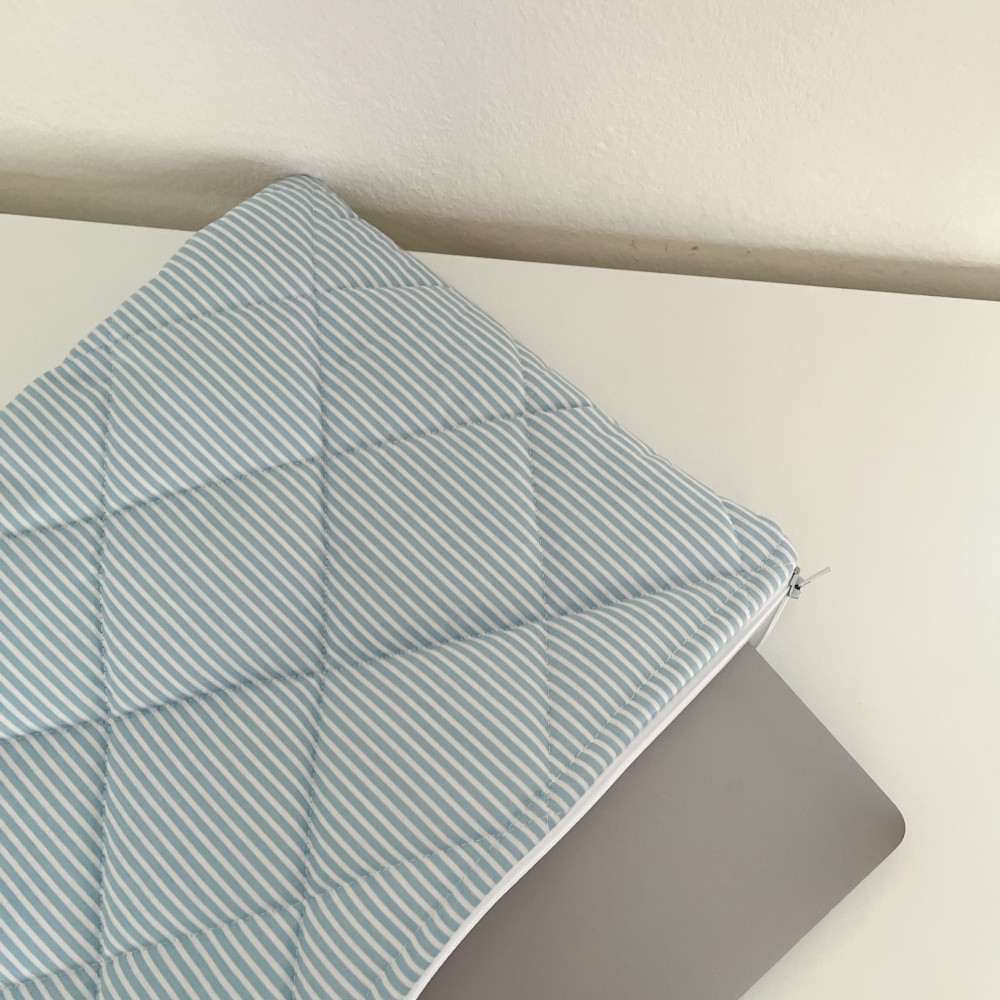 Κράτησε το laptop σου ασφαλές και κομψό με τη Light Blue Striped Laptop Case. Φτιαγμένη στο χέρι από 100% βαμβακερό ύφασμα και αφρώδες ενισχυτικό στο εσωτερικό, συνδυάζει ελαφριά προστασία και διαχρονικό design για δουλειά, σπουδές ή ταξίδια.