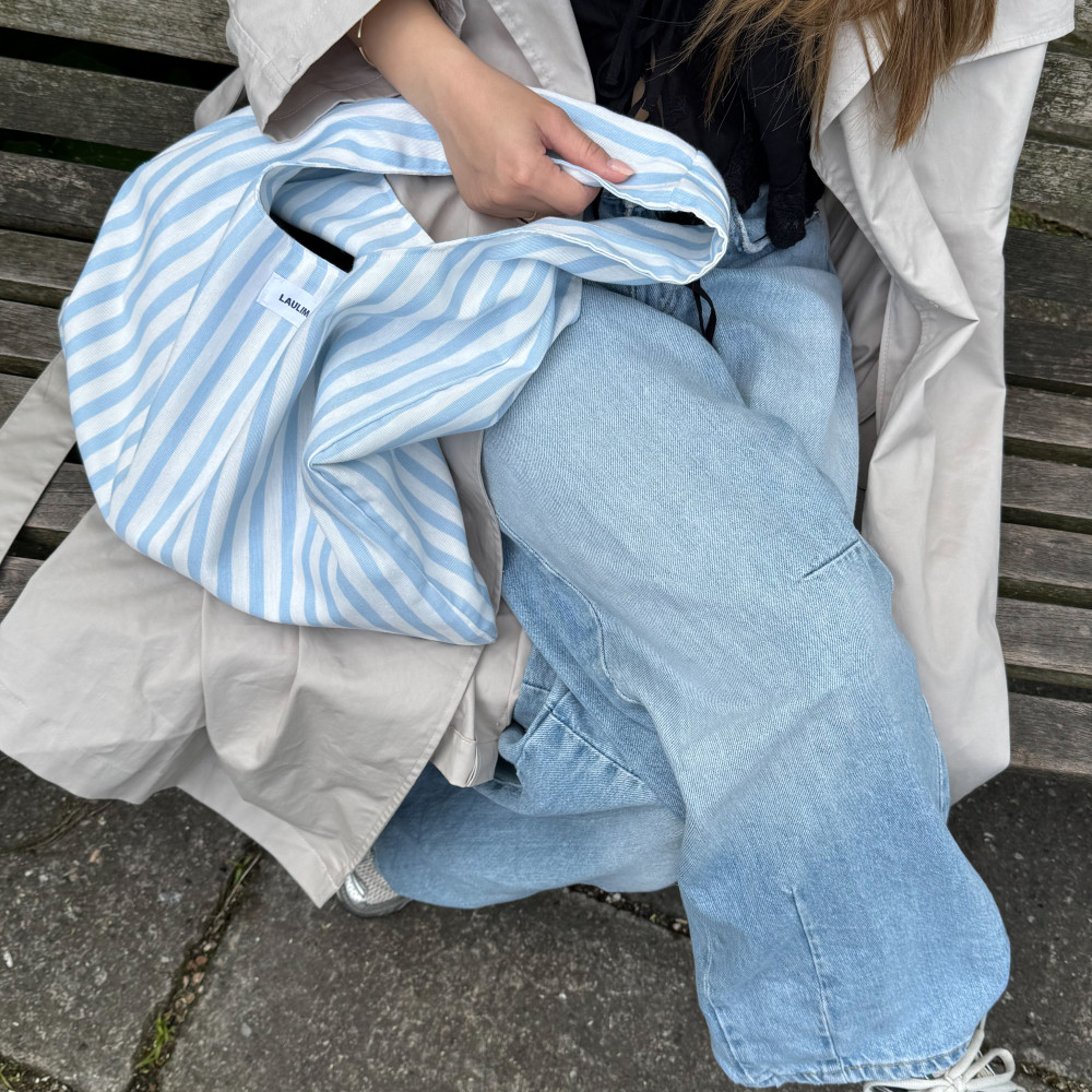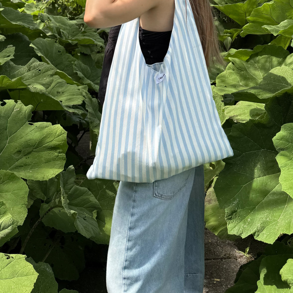 Xειροποίητη tote bag σε γαλάζιο χρώμα με λευκές ρίγες ιδανική για καθημερινή χρήση ή τις καλοκαιρινές σου εξορμίσεις.