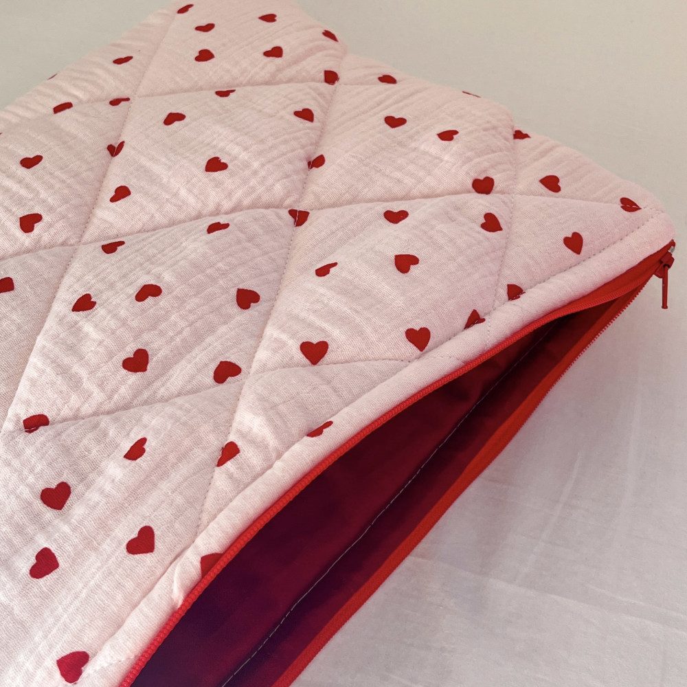 Κράτησε το laptop σου ασφαλές και κομψό με τη Pink Hearts Laptop Case. Φτιαγμένη στο χέρι από 100% βαμβακερό ύφασμα και αφρώδες ενισχυτικό στο εσωτερικό, συνδυάζει ελαφριά προστασία και διαχρονικό design για δουλειά, σπουδές ή ταξίδια.